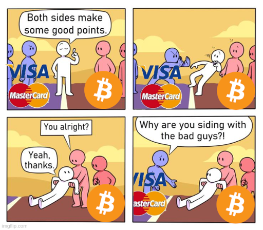 Cryptocurrency is still dependent of a pyramid scheme and criminals-enabling. Credit card companies are still a private owned government branch with no concern for human rights and criminals-enabling.