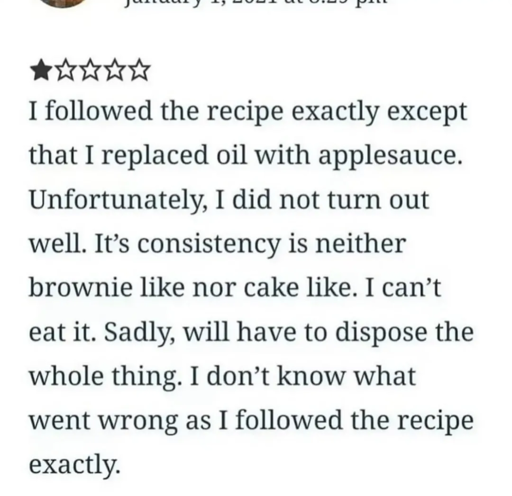 That said, there’s still the issue with the use of “exactly”, however if I remember correctly (and take this with a grain of salt) from my Reddit days, this was an old post and it turned out that the original recipe maker actually suggested the applesauce substitute in the first place.