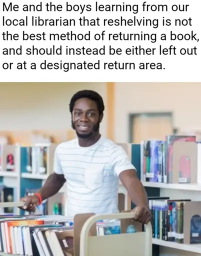 Idk. I think it’s just easier to rely on a specific someone whose job it is to put shit in the proper place than to hope every random person who takes a book off the shelf can put it back in the proper place. Like, I get what you’re saying. It isn’t a big ask to have people return a book after looking at it. But it’s so easy for them to put it in the wrong spot. And once it’s on the shelf, it’s much harder to notice that it’s out of place. It seems counter intuitive, but it’s more efficient to simply leave the book out after looking at it