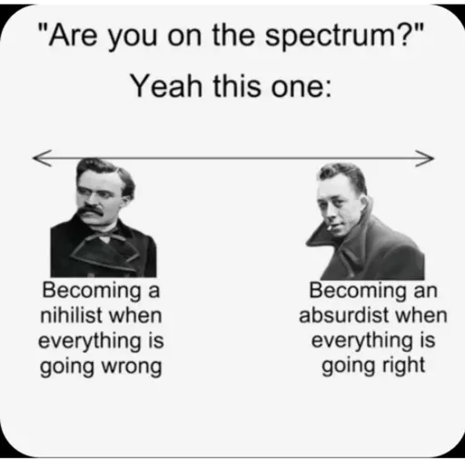 You know that meme of the two guys looking out the bus window, one at a grey cliff, the other at a mountain Vista? It’s that. Cliff guy is thinking “Nothing matters 😫” and Vista guy is thinking “Nothing matters 😂”