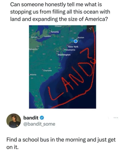 The area labeled “LAND?” on the ocean in the OP map is, give or take, the size of the current amount of land owned by the 100 largest landowning families, private family timberland, golf, and fallow land (meaning land used for nothing). This means that the area that the person in question is asking about is already essentially or literally being used for nothing at all. Before we start undertaking an ecologically-disastrous and fundamentally impossible project, we’d probably figure out ways to use that other land.
