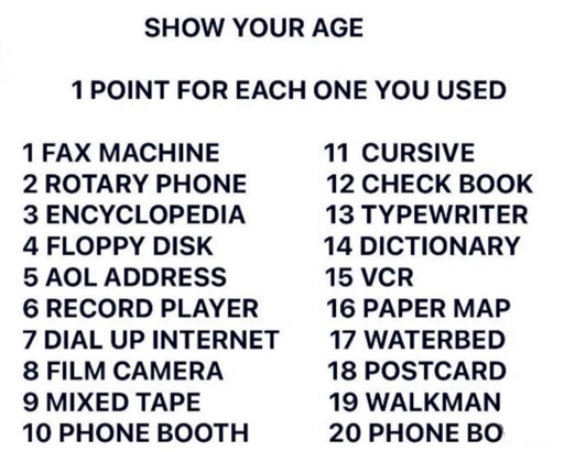 I’m 38, I scored 20 points unfortunately. I only used a rotary phone because my grandmother had one and she also had a typewriter that I’d fuck around with for fun… never used it to write my dissertation for a PhD or anything like that.