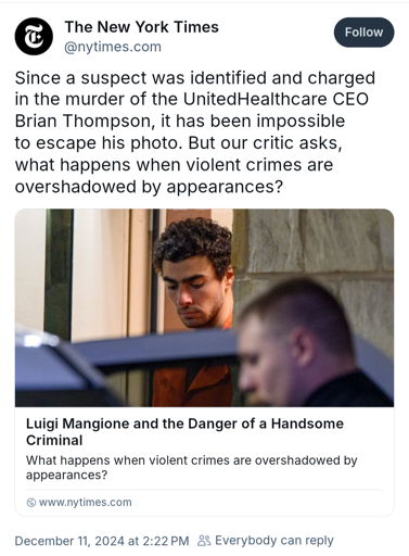 BonesOfTheMoon@lemmy.world to Antiwork@lemmy.ml · 11 months agoIs the New York Times fuckin' serious right now. (AKA another attempt to undermine Luigi's support).lemmy.worldimagemessage-square2linkfedilinkarrow-up11arrow-down10