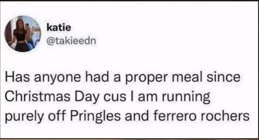 Real meals come back when you’re out of Rochers and the only sweets left are those disgusting cherry Brandy things.