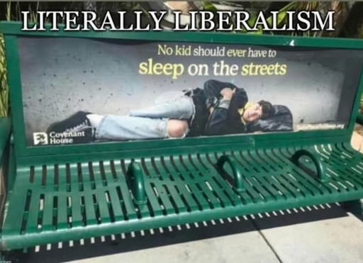 - How is this liberalism? - Liberalism is a political-economic ideology that gives a friendly face to capitalism. While market discipline enforces inhumane measures like a park bench that prevents homeless people from sleeping on it, simultaneously the same society produces the friendly face “solution” of a small, overburdened charity organization to help homeless people. - So the state, which has the authority to enforce public park design, or, you know, regulate housing, won’t help. The liberal solution to systemic social inequity is charity.