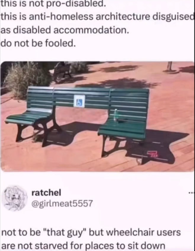 minus-squareAch@lemmy.worldlinkfedilinkarrow-up19·6 days agoThe obvious response to this is to guerilla install regular benches, but put wheelchair legs on the legs so we can roll sleeping homeless men into bank lobbies.