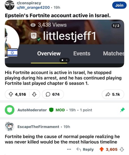 Here we have: “Epstein was found dead in his cell, he was probably murdered”, being “out-conspiracied” into “lol, no, he faked his death so he can play Fortnite, his account was active a couple of days ago”.