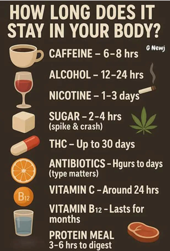 At least the coffee (or more specifically caffeine) one is the halflife, not when it is all gone, so if you drink two cups of coffee you’ll have roughly one cup still in your system after 6 hours