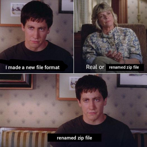 ☆ Yσɠƚԋσʂ ☆@lemmy.ml to Programmer Humor@lemmy.mlEnglish · 2 years agoNew File Formatlemmy.mlimagemessage-square4linkfedilinkarrow-up10arrow-down10
