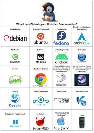Arch is the denomination that is super proud of itself, despite being messed up for most people. OpenSuse is Baptist due to it’s general reliability and flexibility. ChromeOS is Southern Baptist because it’s barely recognizable as Linux.