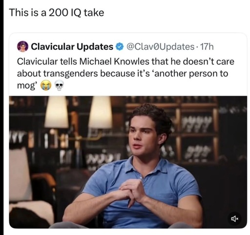 I knew this because my 16 year old said the other day “did you see that Clavicular got physique-mogged by the ASU frat leader”