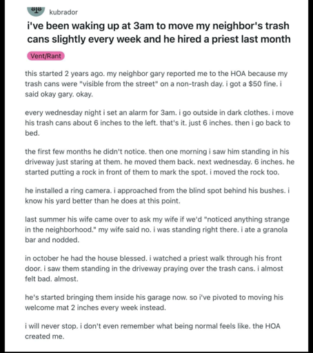 Its not about the trash cans, its about making sure your neighbours know YOU are calling the shots. If it wasnt the trashcan it would have been the grass a half-inch too high, or the paint on the door chipped slightly, or gravel leaving the premises, or dirty windows.