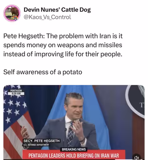 minus-squareBlameTheAntifa@lemmy.worldlinkfedilinkarrow-up29·edit-226 days agoFor anyone wanting verification. While the quote is paraphrased but he absolutely said this. https://www.c-span.org/program/news-conference/secretary-hegseth-and-joint-chiefs-chair-hold-briefing-amid-iran-conflict/675871