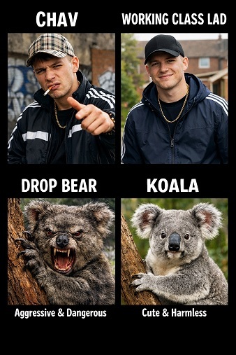 Both twist something (staples of young white working class fashion, tracksuits, gold, caps, and trainers, a cute Australian animal) into something dangerous (chav/drop bear) and that caricature is wrongfully said to be it’s own thing (a subculture/a carnivorous marsupial species - in reality, sociologists have confirmed there was no “chav” subculture, nobody or almost nobody identified as one, it was something made up by upper class tabloids to demonise the white British working class, like how zoologists have said there’s no “drop bear” species, it was something to make people fearful of Koalas) in order to make people fearful (chav especially is riddled with classism, though.)