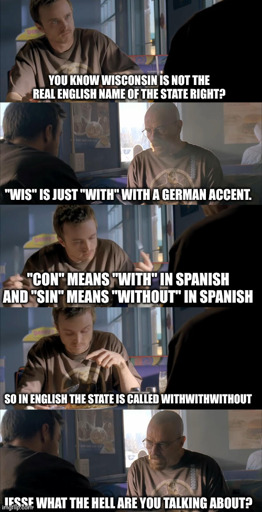 The actual origin is almost as goofy. “‘Wisconsin’ (originally ‘Meskonsing’) is the English spelling of a French version of a Miami Indian name for a river”