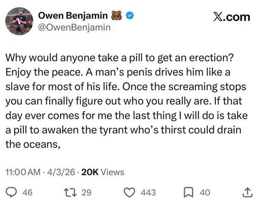 This tweet does not understand the difference between libido and erection. I’m happy for him that he’s so ignorant. I wish the same for all of you, truly.