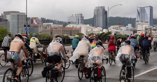 The World Naked Bike Ride (WNBR) is an international clothing-optional bike ride in which participants plan, meet and ride together en masse on human-powered transport (the vast majority on bicycles, but some on skateboards and inline skates), to “deliver a vision of a cleaner, safer, body-positive world.” The largest iteration of the WNBR in the world takes place in Portland, Oregon averaging approximately 10,000 participants and thousands of spectators.