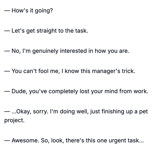 minus-squarelib1 [comrade/them]@hexbear.netlinkfedilinkEnglisharrow-up7·19 days agoMy favorite is the people who respond “Oh, you know, living the dream”. Only the most depressed people in the pits of despair answer like that