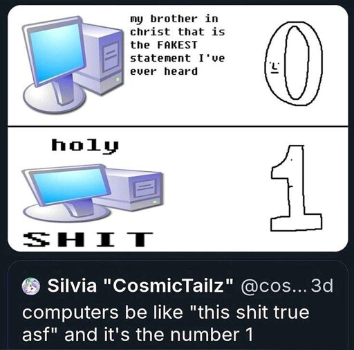 Technically, 1 and 0 only represent the states of powered and unpowered (yes, it’s more complicated than that - shut up). While “true” is usually represented as a powered state, that’s only because of tradition - or more accurately, because we decided to label it that way. In the strictest sense, true only equals true, 1 only equals 1, and a transistor with a positive charge is simply that - a charge. Binary is just one way of representing these states, but so are hexadecimal, decimal, and even strings. It’s all a matter of convenience and convention - and those conventions don’t always follow strict logical rules.