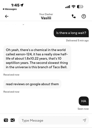 I switched to the earn by time thing on Dasher because of the waits at Taco bells. It’s insane. I spent an hour waiting on two orders the other day, one of which was 3 cheese wraps and a Baja blast, and the other was just like some fucking tacos and a burrito. It was absolutely unreasonable. But hey, dash by time, I got paid like 15 bucks for standing there scrolling through Lemmy