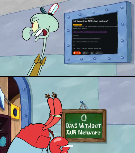 The biggest risk, IMHO, for malware getting slipped into a package is orphaning a popular package, and having it adopted by a malevolent user. This is something I personally look out for. If the maintainer changed, I make sure to check the commit history to see what they did. Most of the time it’s genuine fixes, but if anything is changed without a damn good and obvious reason, hit up the AUR mods and ask for help. This is how malware is spotted. Also, typically only the version is bumped in a PKGBUILD on an update, which is a change I feel safe waving through, too. If the download URI changes, or patches are added, I do look at them to determine the reason, and if that isn’t explained well enough to understand, that’s a red flag. Better ask someone before running this.