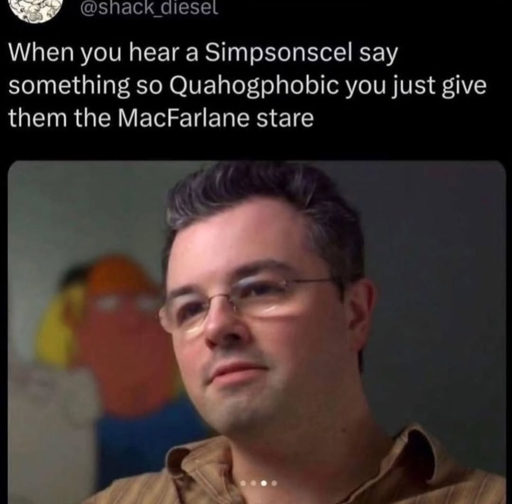 minus-squarePotatoesFall@discuss.tchncs.delinkfedilinkarrow-up0·2 months agoQuahog is the town where Family Guy plays. Seth MacFarlane is the creator of Family Guy. Simpsons fans often rip on family guy for copying Simpsons.