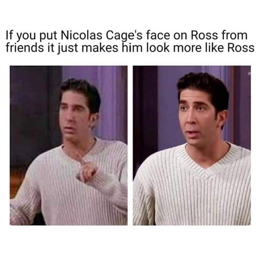 another attempt similar to image in comment I'm replying to, where Ross from friends has face swapped onto Nicolas Cage's head. Warmer colours and less harsh transition around face, more natural looking