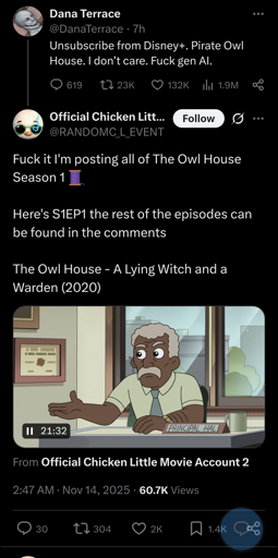 LiamBox@lemmy.ml to Piracy: ꜱᴀɪʟ ᴛʜᴇ ʜɪɢʜ ꜱᴇᴀꜱ@lemmy.dbzer0.comEnglish · 2 months ago'The Owl House’ creator Dana Terrace situation with Disney+ positive views on AI generated contentlemmy.mlimagemessage-square56linkfedilinkarrow-up1474arrow-down14