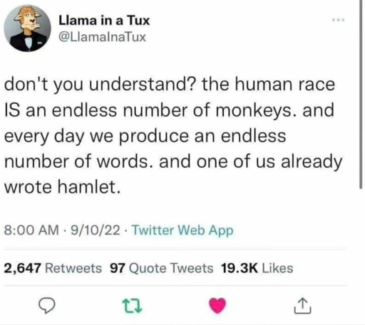 minus-squaremacniel@feddit.orglinkfedilinkarrow-up0·1 year agodamn, that monkey must be pretty prolific, perhaps even rivaling Shakespeare! Do we know their name?