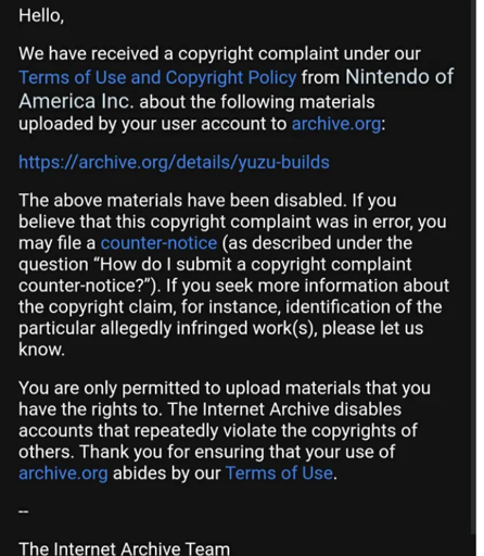 arrow-up11arrow-down1imageNintendo submit Yuzu DMCA request to Internet Archivereddthat.comardi60@reddthat.com to Piracy: ꜱᴀɪʟ ᴛʜᴇ ʜɪɢʜ ꜱᴇᴀꜱ@lemmy.dbzer0.comEnglish · 2 years agomessage-square2linkfedilink