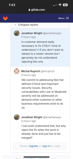 cleric_splash@lemmy.world to Linux@lemmy.ml · 3 years agoRed Hat refuses Alma's CVE patches to CentOS Stream; says "no customer demand"plus-squarei.redd.itimagemessage-square0linkfedilinkarrow-up11arrow-down10